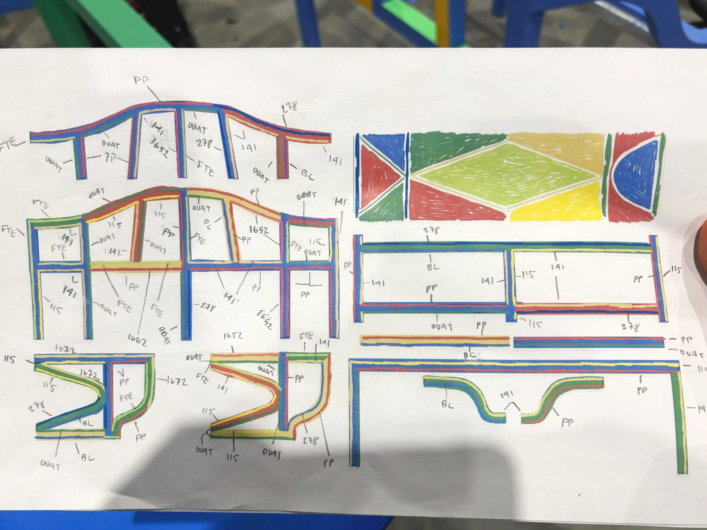 This installation was made to look colored in. After blocking in the base colors (on the benches, that would be the pink, periwinkle, green, and yellow blocking) we did the colorful linework. The sketchy, colored pencil look was achieved with roller covers cut to 3”, put onto mini roller handles, and then rolled onto the edge. any patchiness was touched up with a foamie.