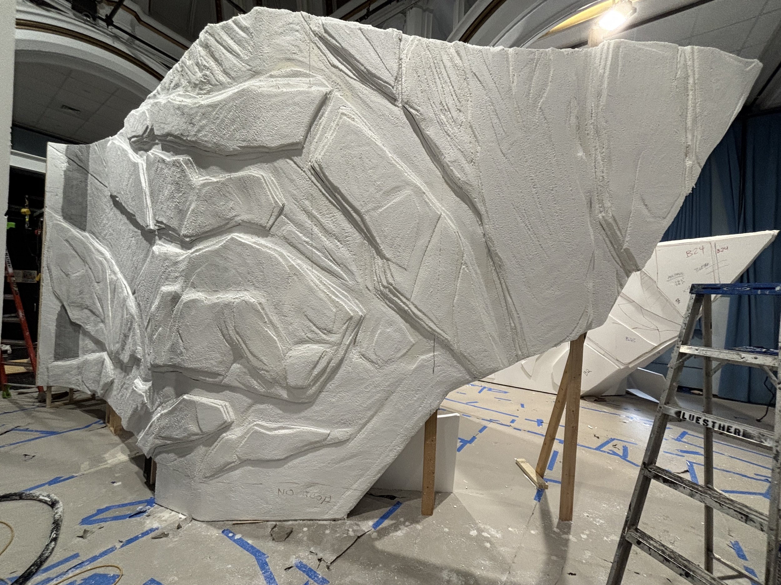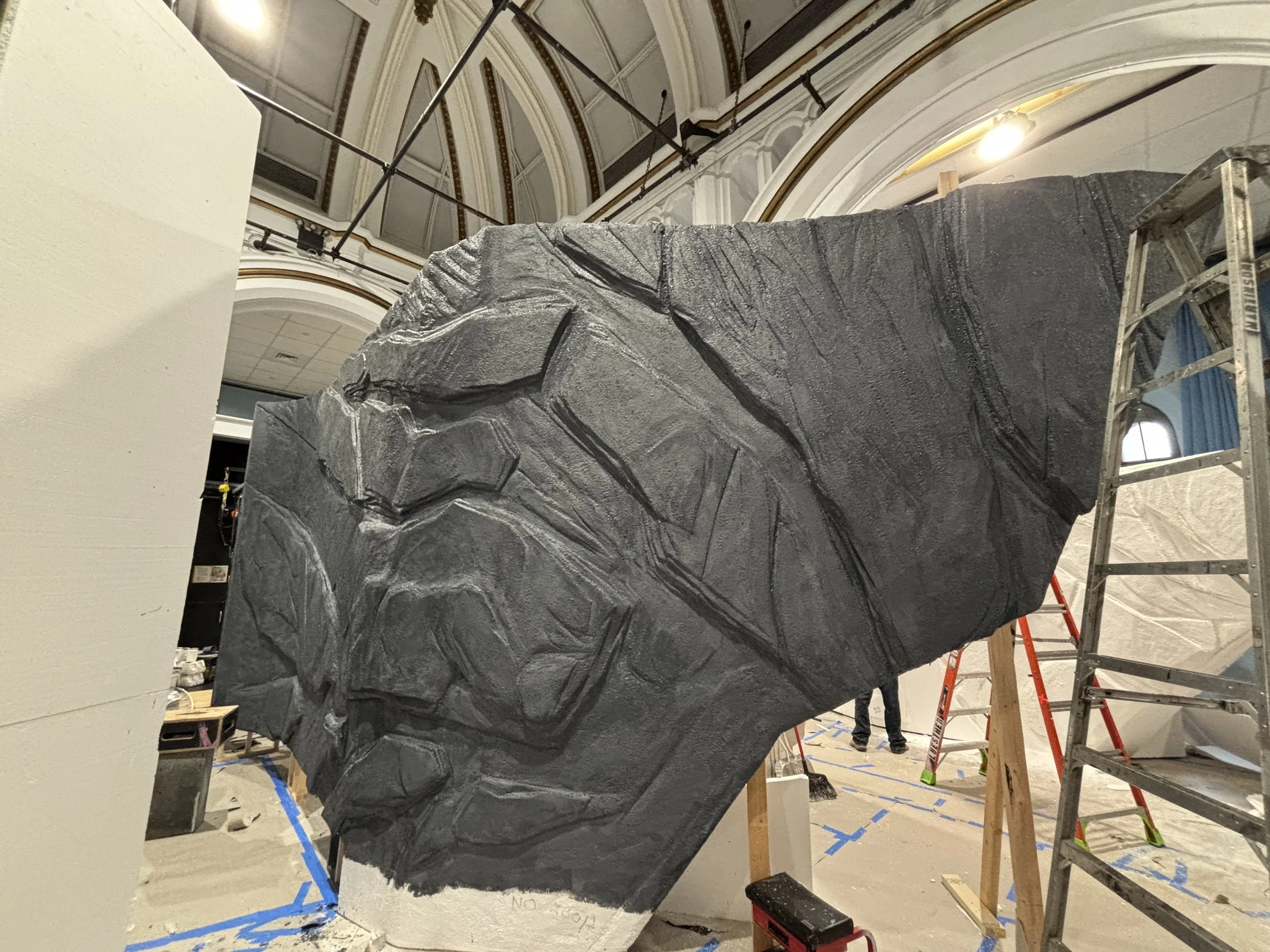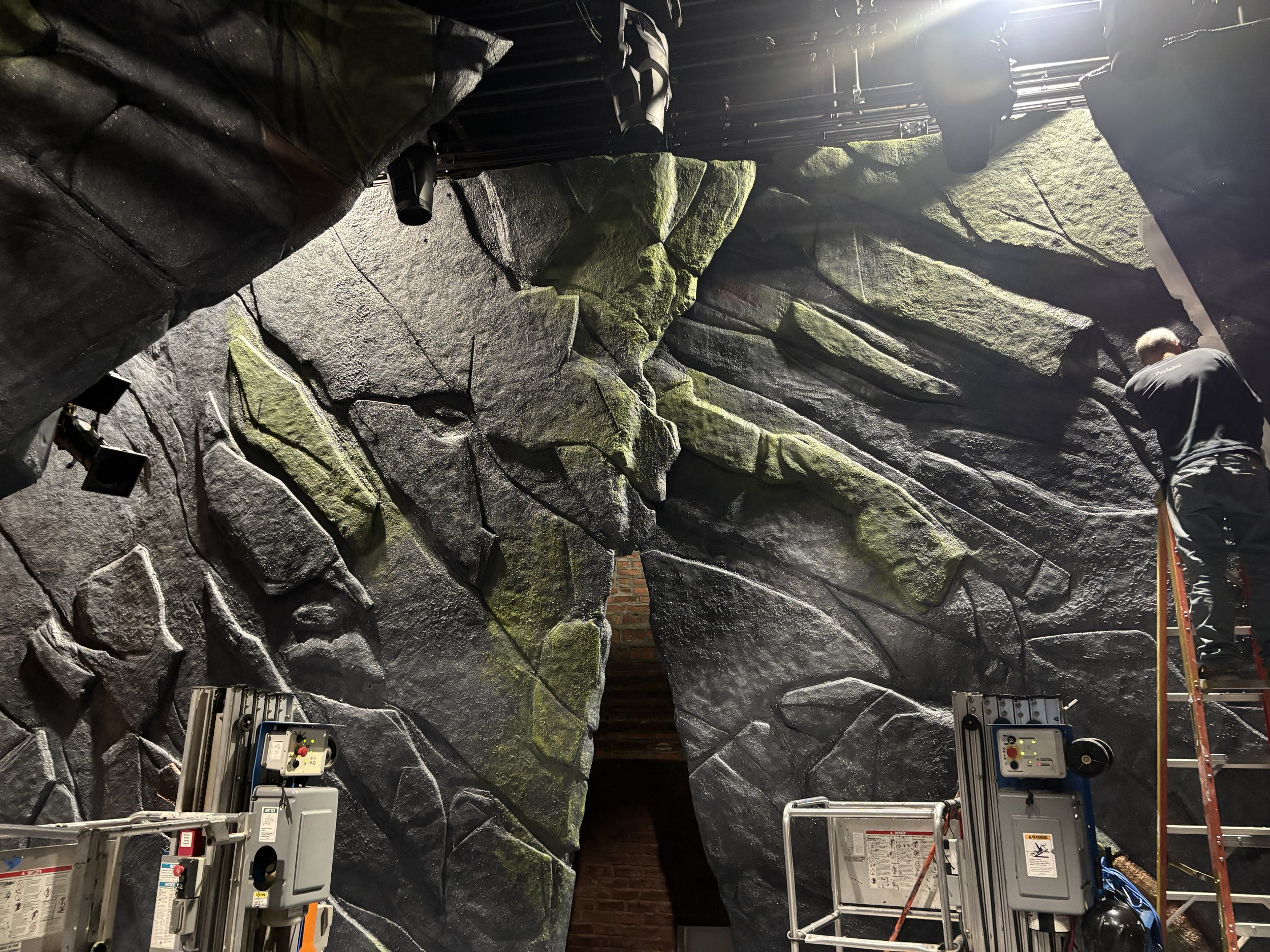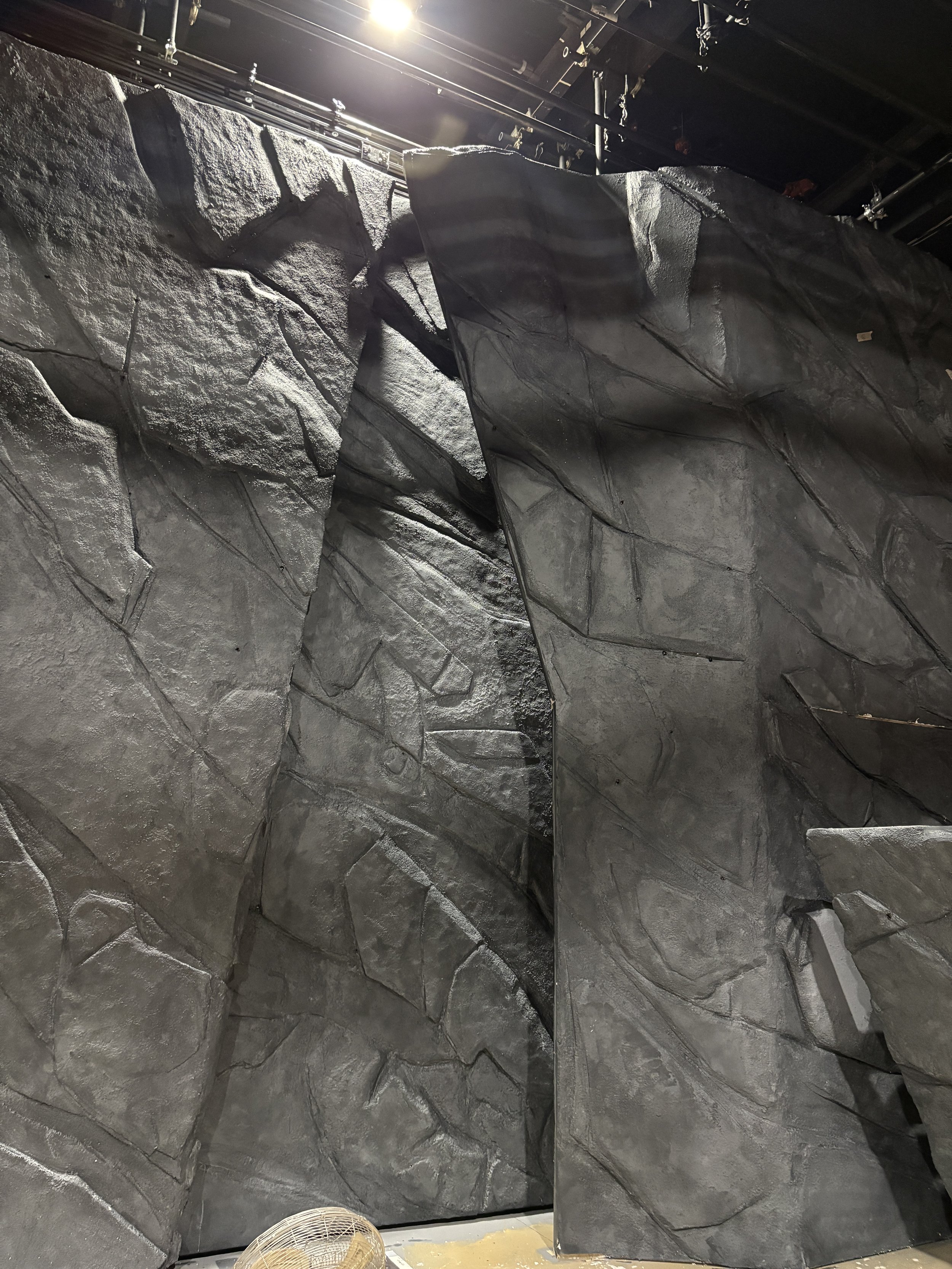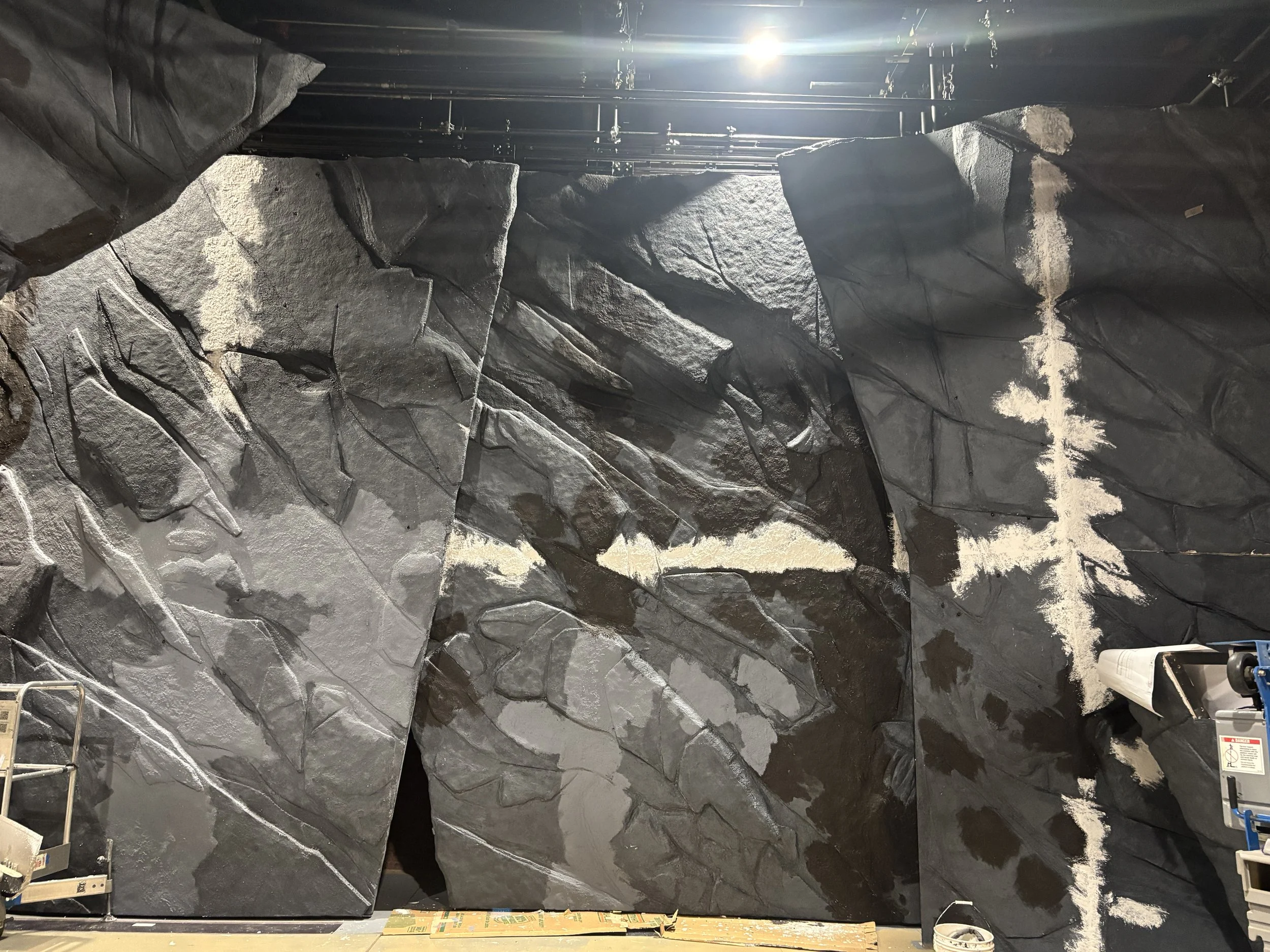 We applied sheets of foam using contact adhesive, starting with a 1/2” layer and applying labeled pieces to build up rocks. We then carved them down, and applied Jaxsan, then the grey rock paint treatment. There were quite a few sections of wall!