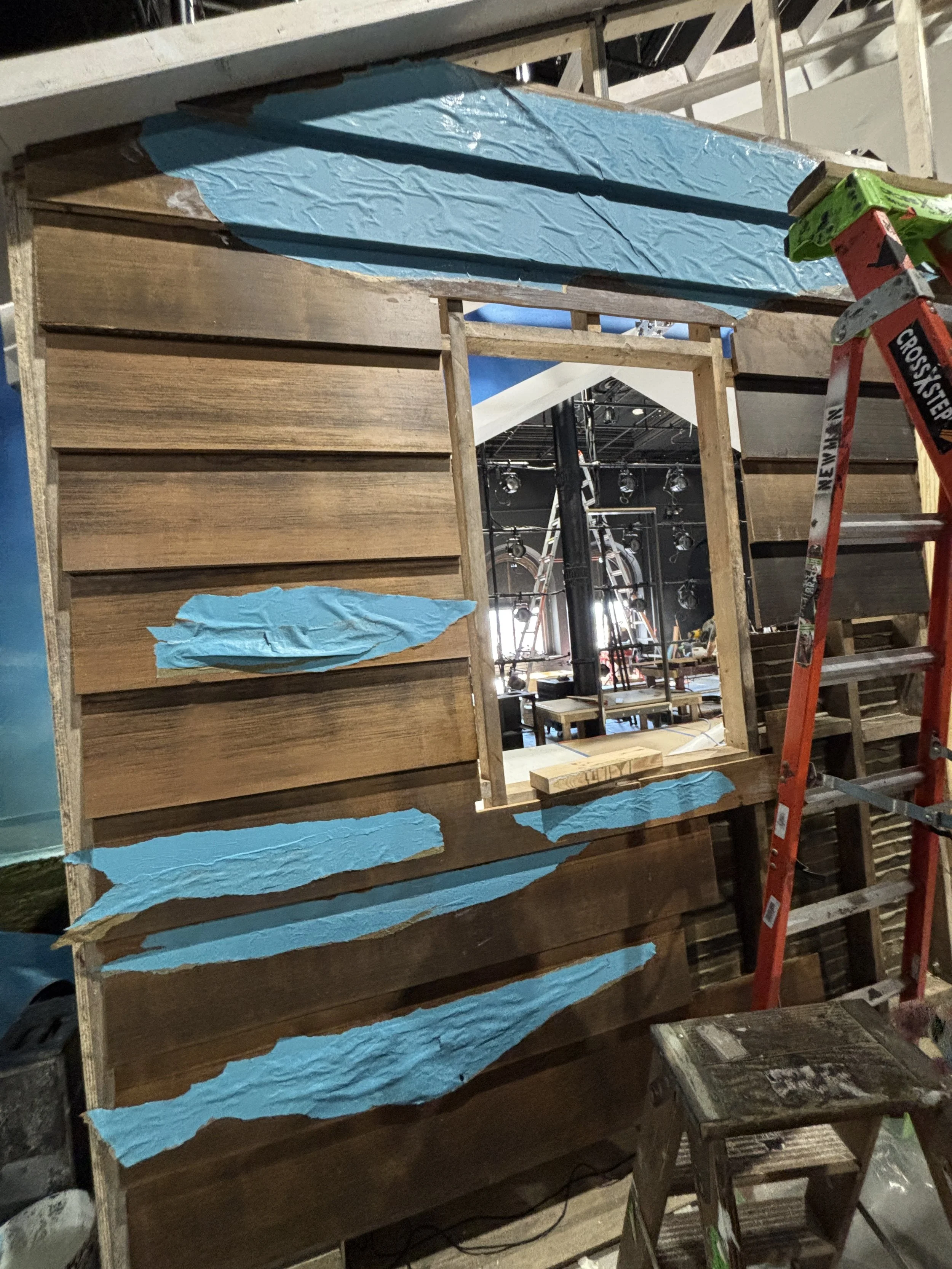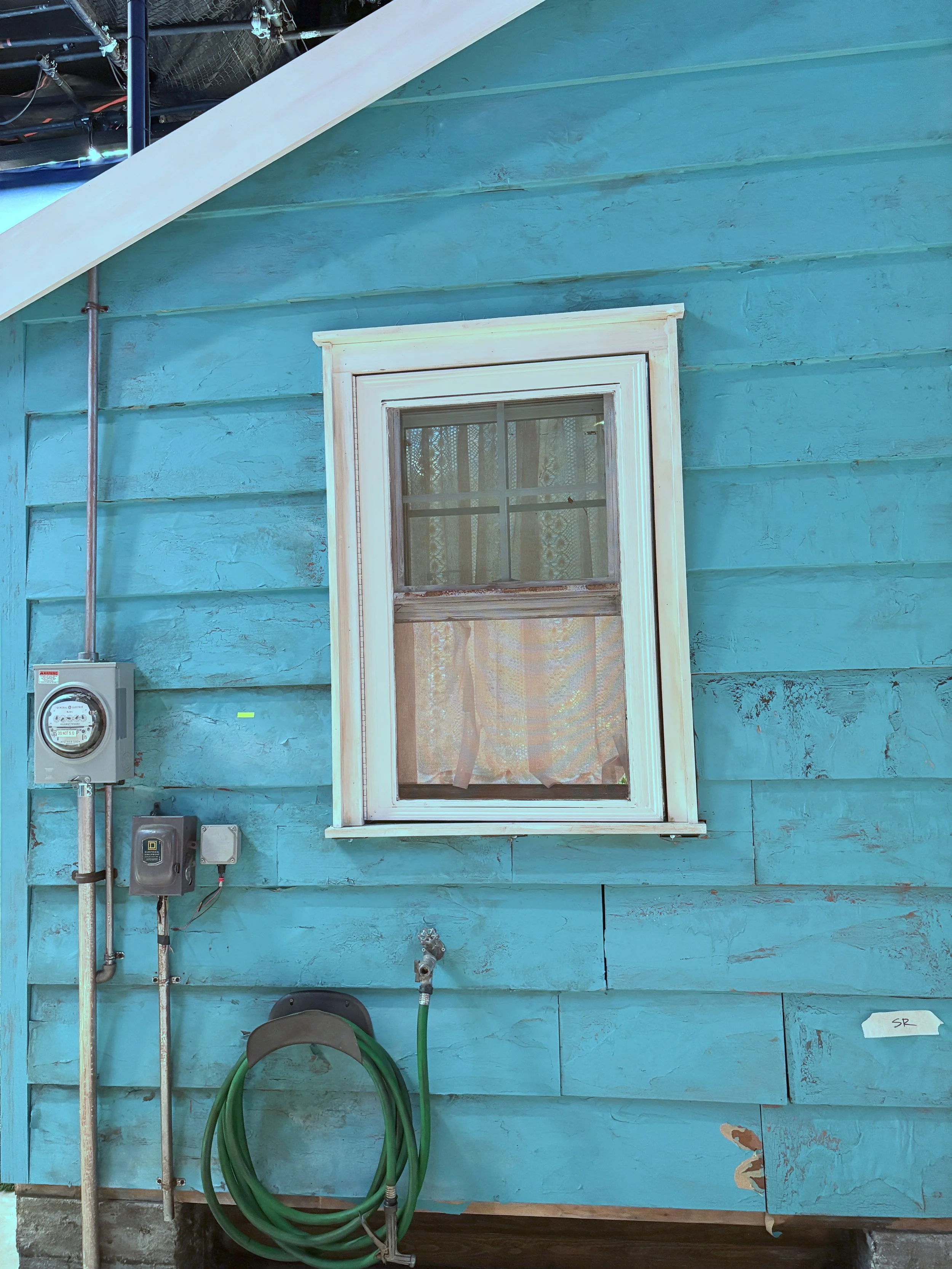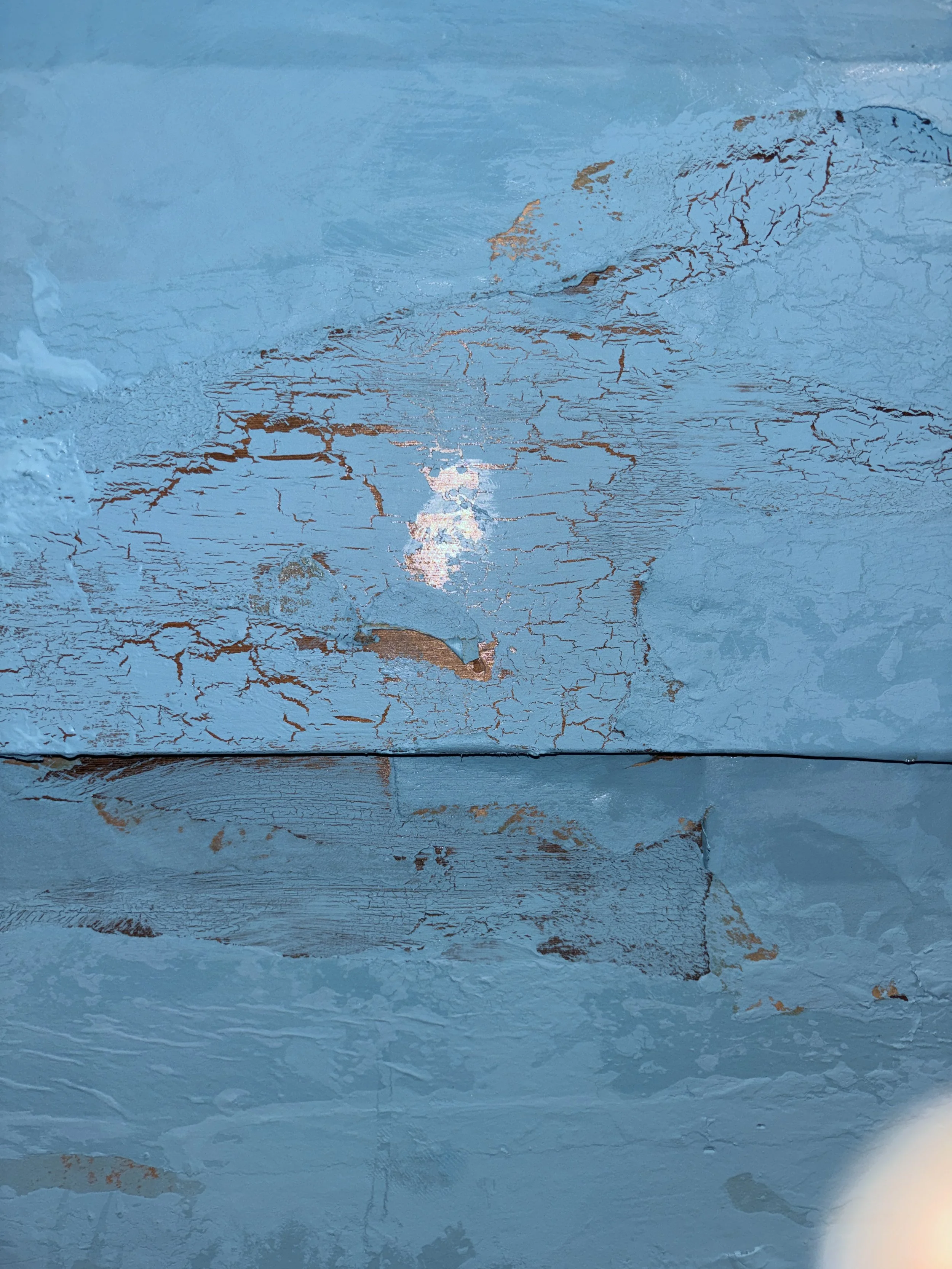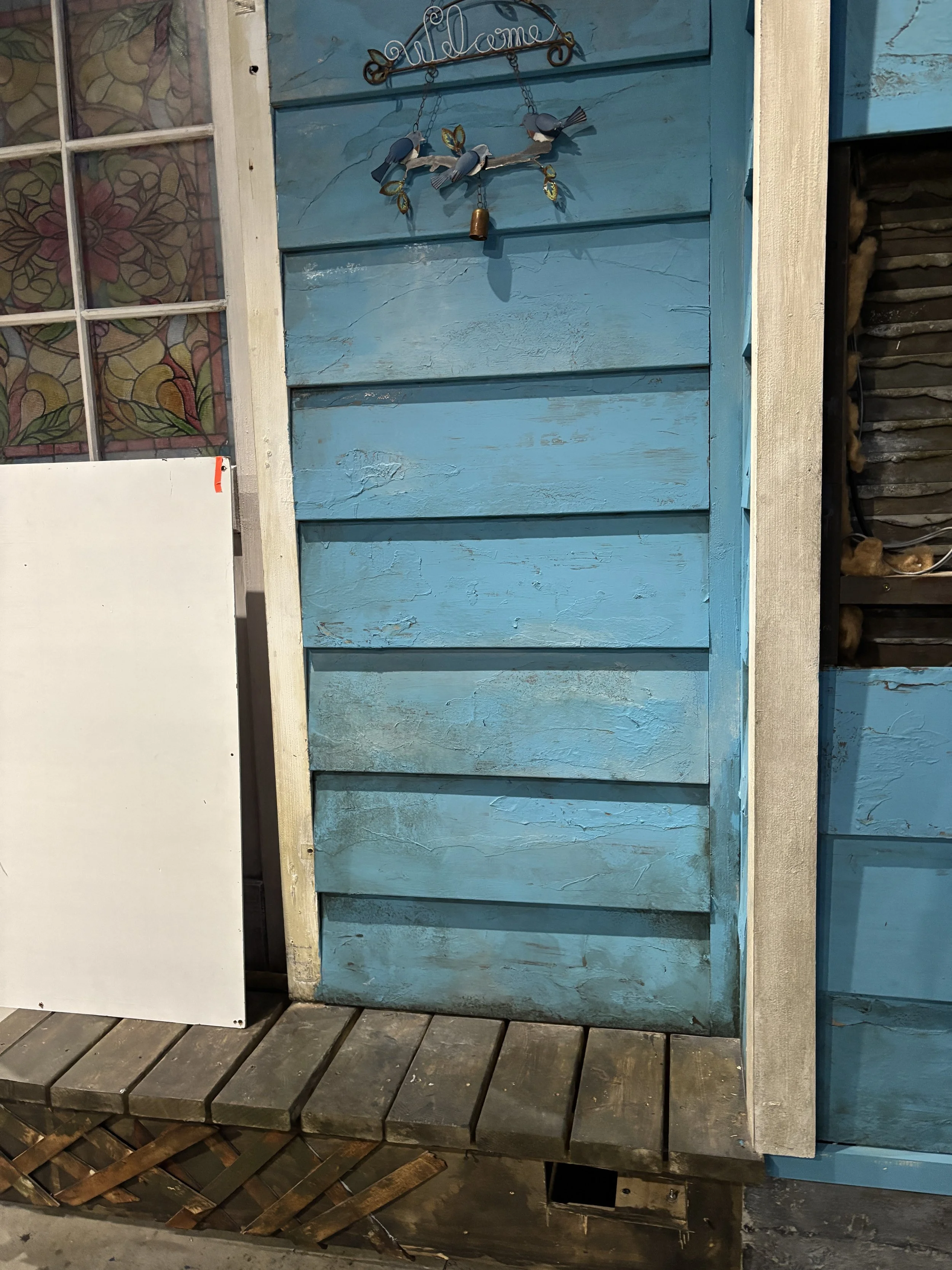 We aged cedar siging with vinegar and steel wool. Ww then applied blue-painted brown paper with glue, let dry, then peeled it off. We did ended up tearing most of the paper off. We then applied crackle paste, then applied the paint, leaving some holidays and buildup. We then aged to achieve a worn, painted over and water-damaged siding.
