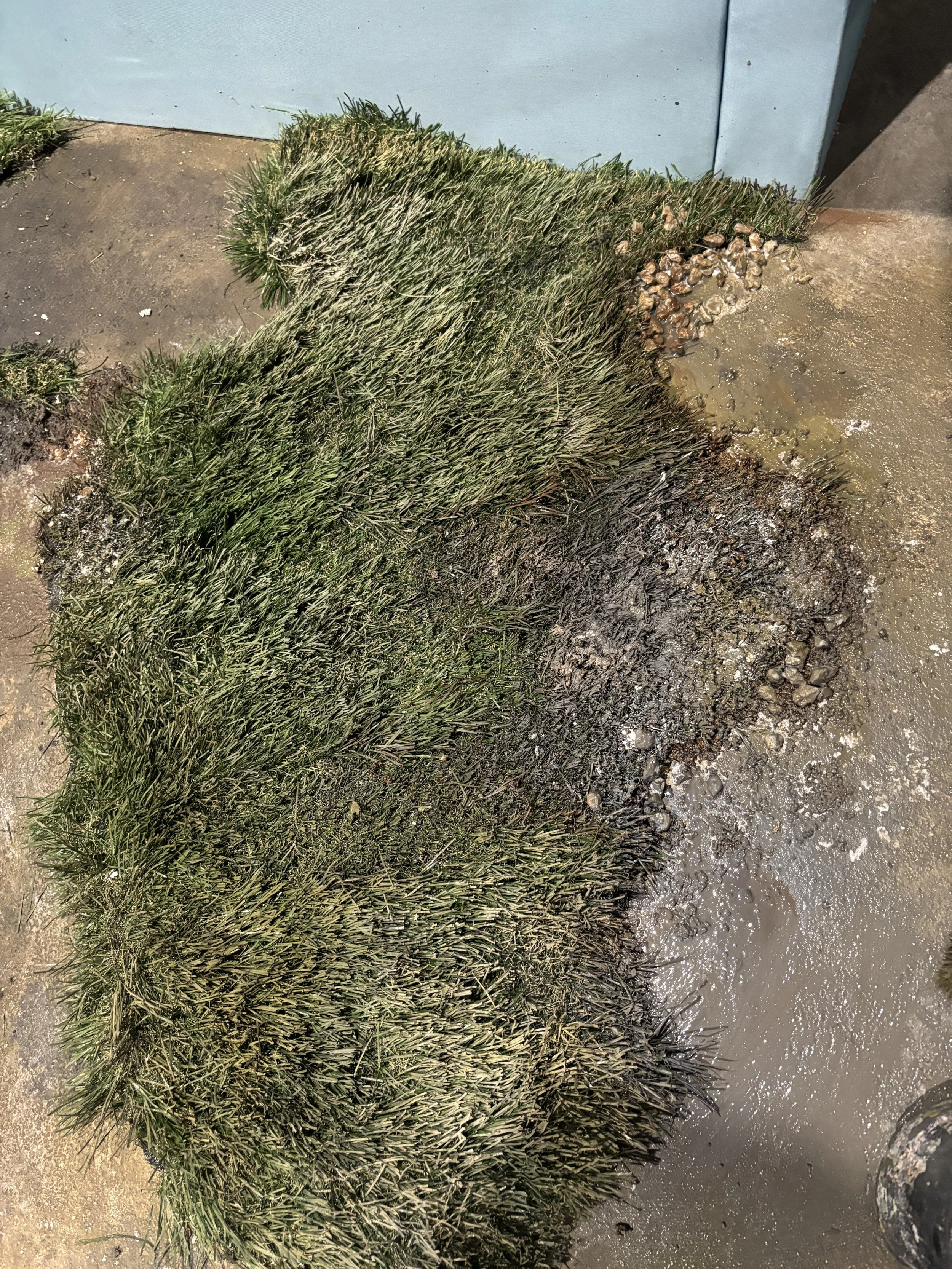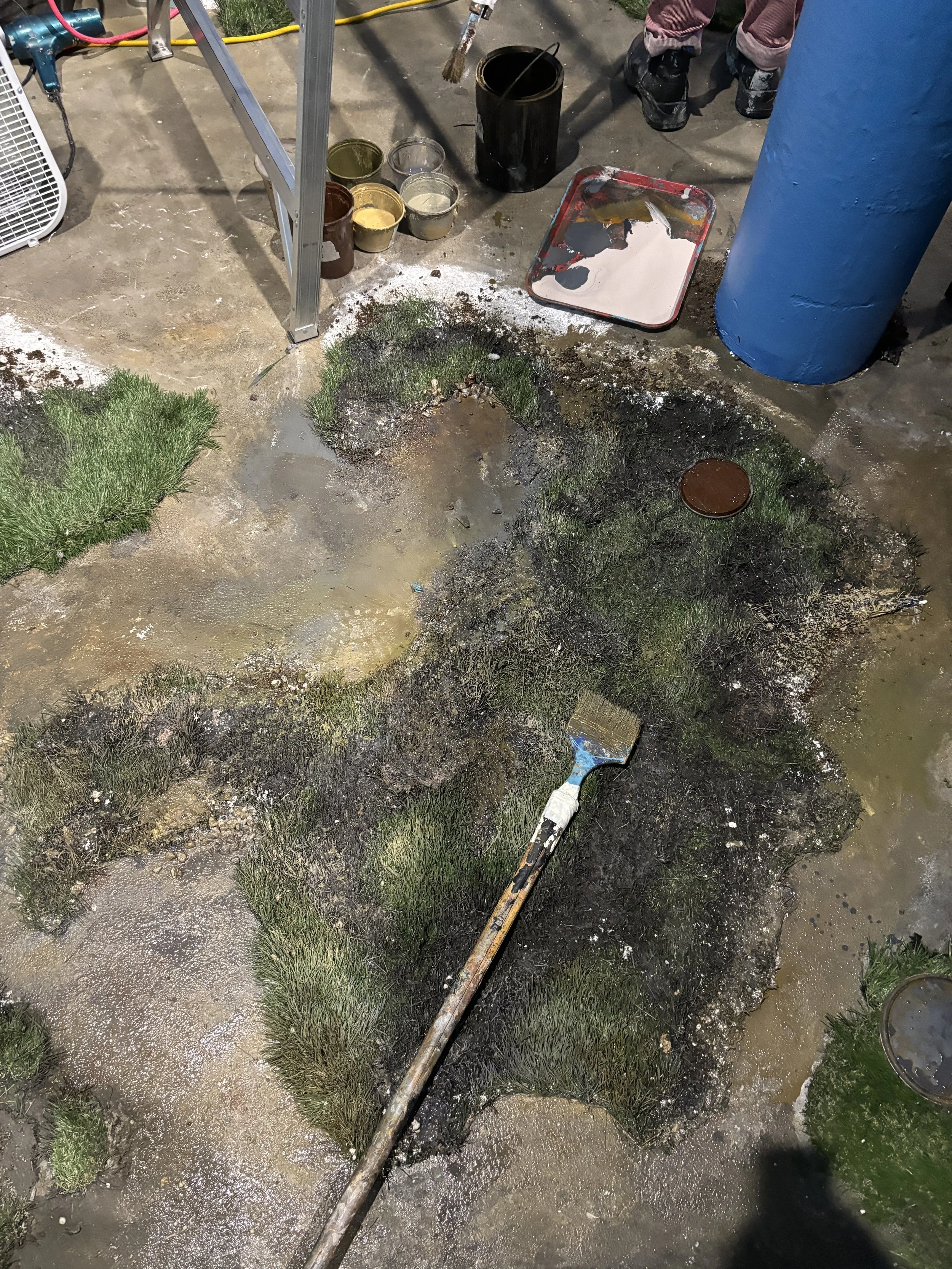 Fake grass was cut into patches, then shorn down with sheep sheers to look patchy and walked on. It was stapled to the deck. Jaxsan was applied, then various washes of browns and greys were applied. Rocks and dyed cork were glued in the space between and partially on the patches of grass.